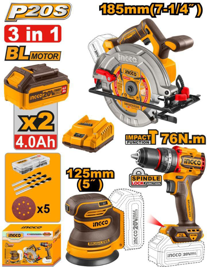 COMBO A BATERIA 3 PIEZAS SIERRA CIRCULAR / LIJADORA / TALADRO PERCUTOR INGCO