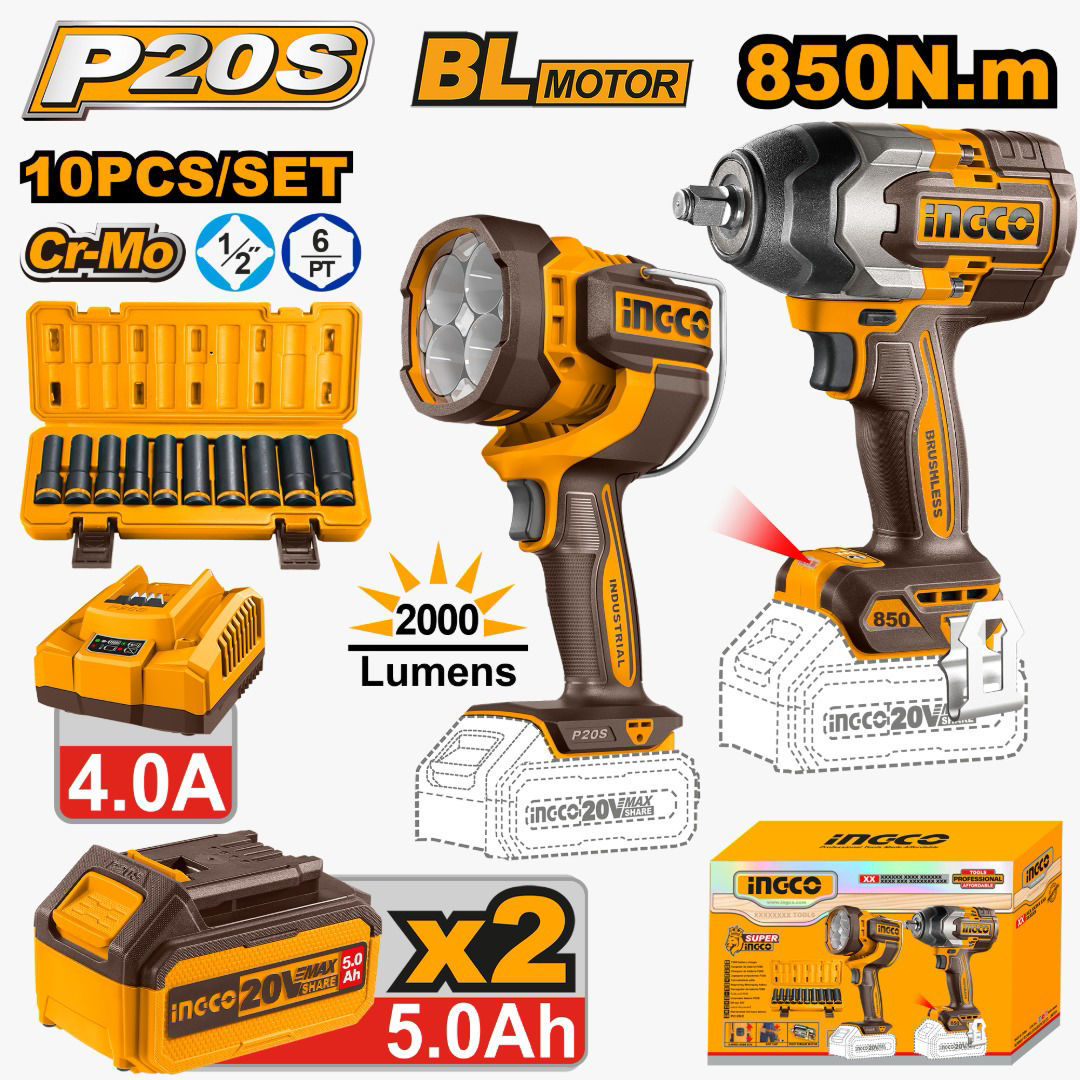 KIT COMBO A BATERÍA P20S 20V CON LLAVE DE IMPACTO + LINTERNA CON 2 BATERÍAS, CARGADOR + SET 10 DADOS 1/2" INGCO