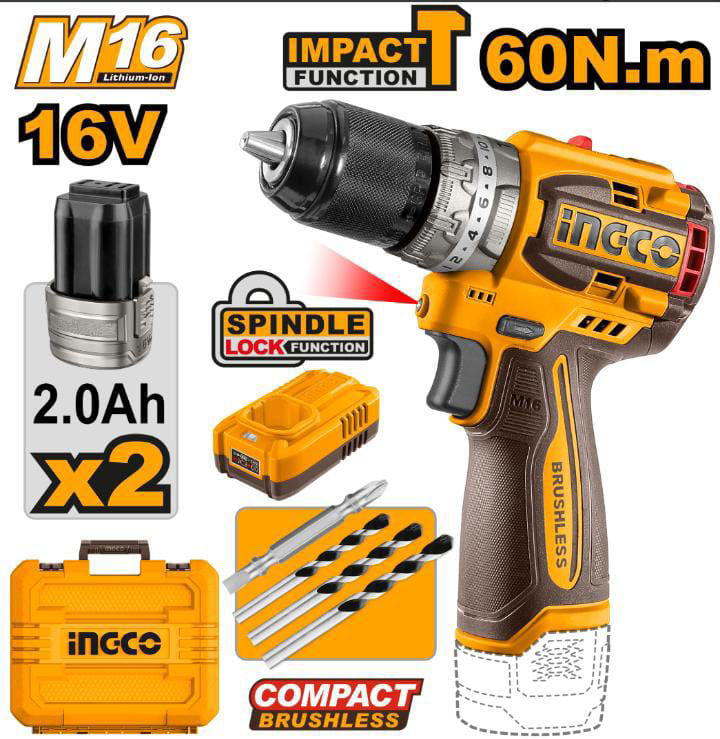 TALADRO PERCUTOR BATERÍA 16V 13MM 60NM INGCO