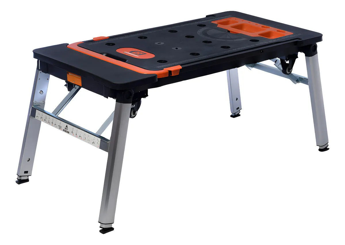 Incluye: bandeja de herramientas, transportador de ángulos, aberturas para caballete, agujero de regla remolque, agarradera 2 en 1, patas de aluminio con regulador de altura, ruedas universales con freno, placas auto-regulables para los soportes.