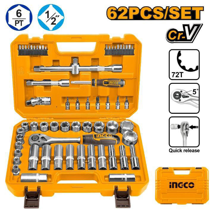 JUEGO DADOS 62 PIEZAS ENCASTRE 1/2" 10-32MM INGCO